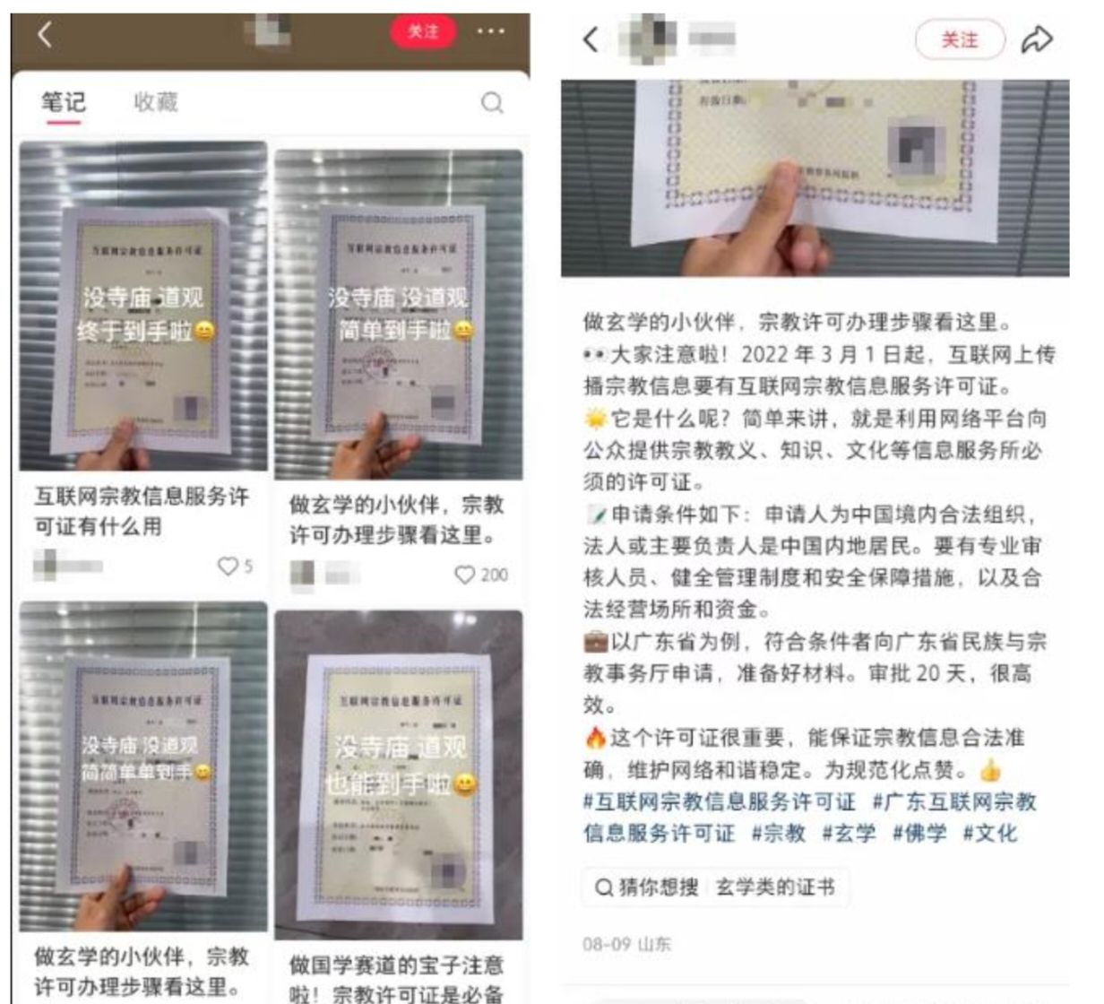 这账号就是抓住这个心理专门代办“宗教活动场所备案证”。内容简单粗暴到离谱:每张笔记就是怼脸拍证书,配文“普通人20天下证,玄学博主必备”。流量高的不过500赞,低的只有9个赞,但评论区清一色“多少钱?怎么办?”9个点赞里6个是精准客户,这转化率比投千川还猛。